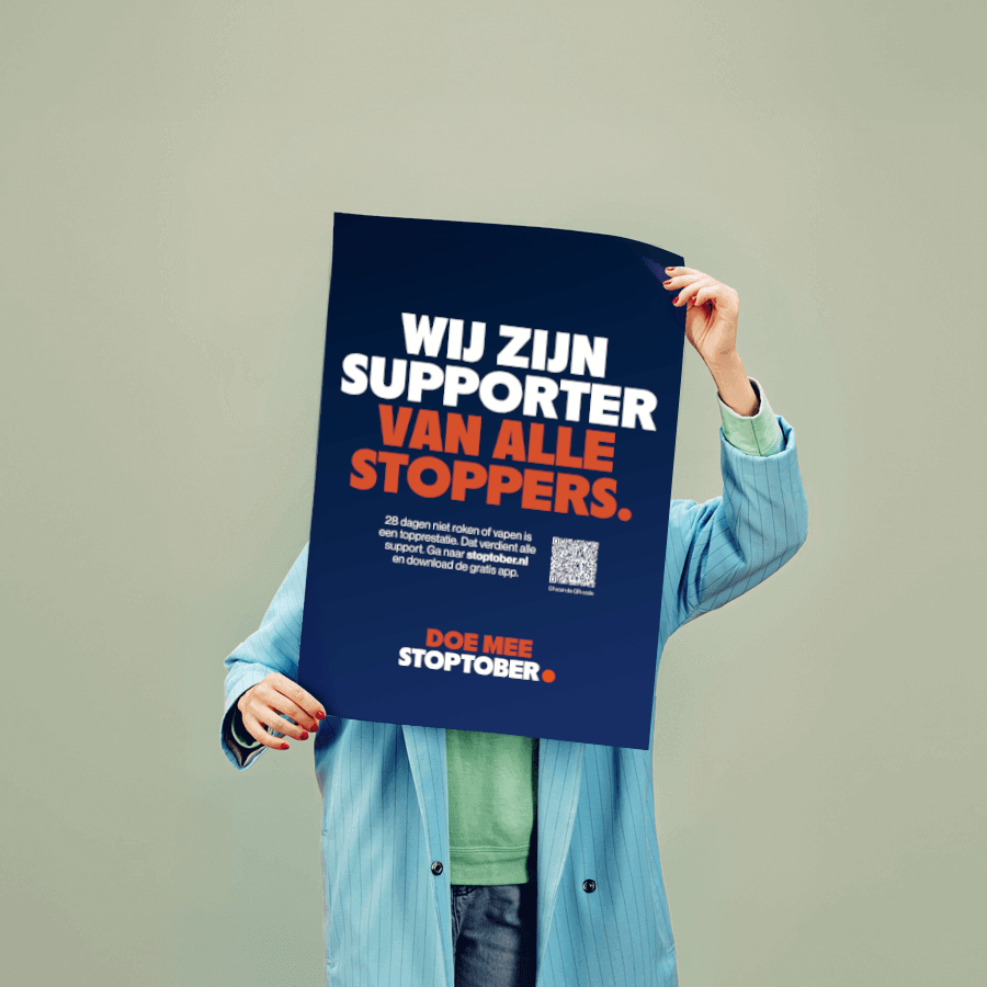 Stoptober is hét moment om te laten zien dat je stoppers steunt om hun nicotineverslaving onder controle te krijgen. Je kunt ze motiveren om mee te doen met Stoptober door ze te wijzen op de app of je steun uit te spreken. Door posters op te hangen of een bericht op intranet te plaatsen. Of door de omgeving, bijvoorbeeld je ingang of terras, rookvrij te maken.